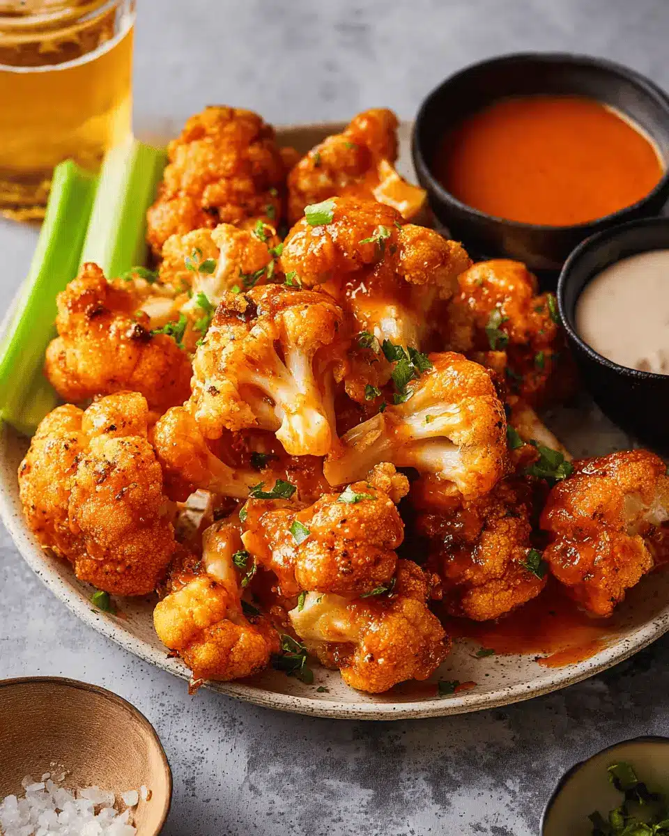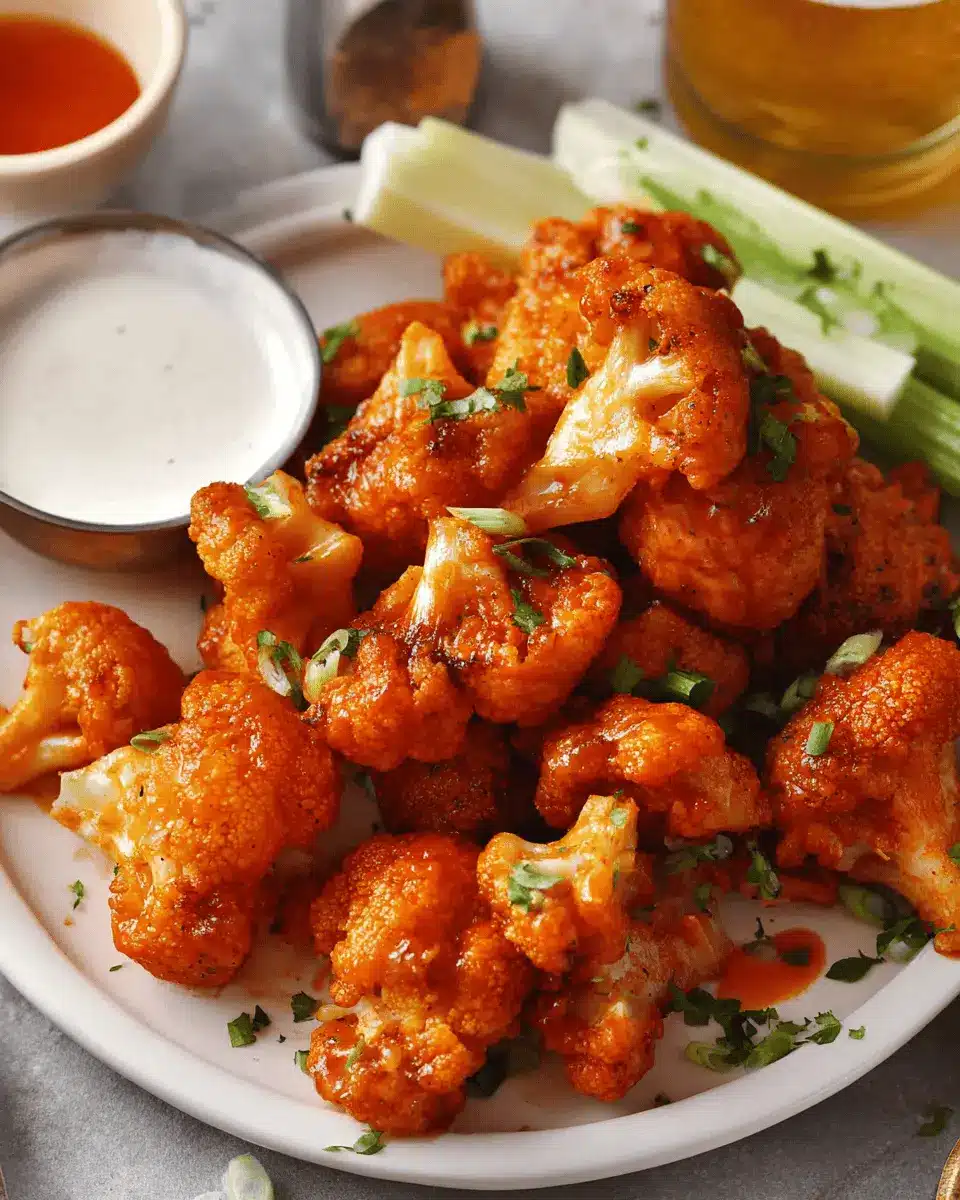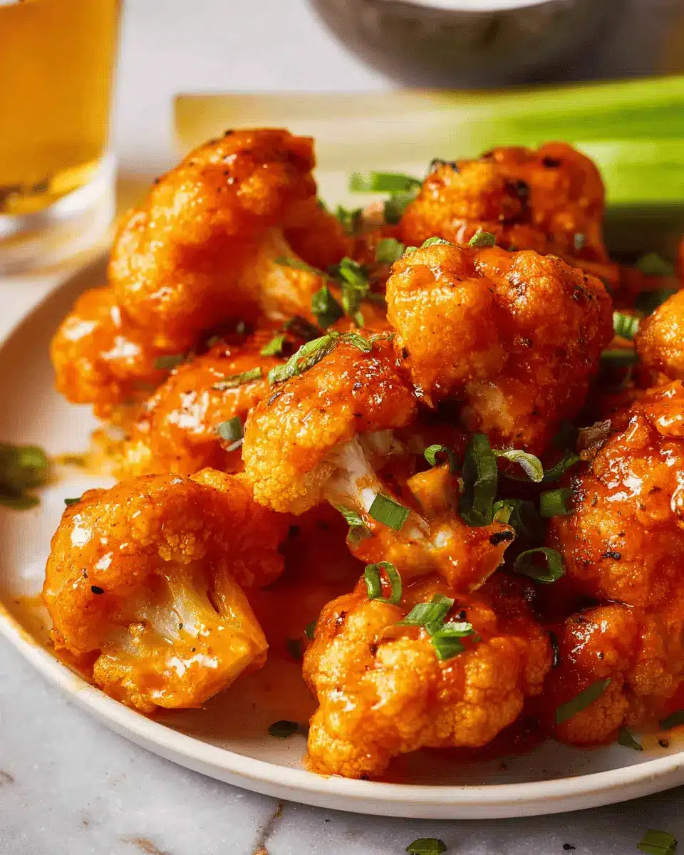 Absolutely! If you don’t have an air fryer, you can roast the cauliflower in the oven. Simply preheat your oven to 450°F (232°C), spread the coated cauliflower florets on a baking sheet, and bake for about 25-30 minutes, flipping halfway through, until they’re golden brown and crispy. Just be sure to toss them with buffalo sauce toward the end!