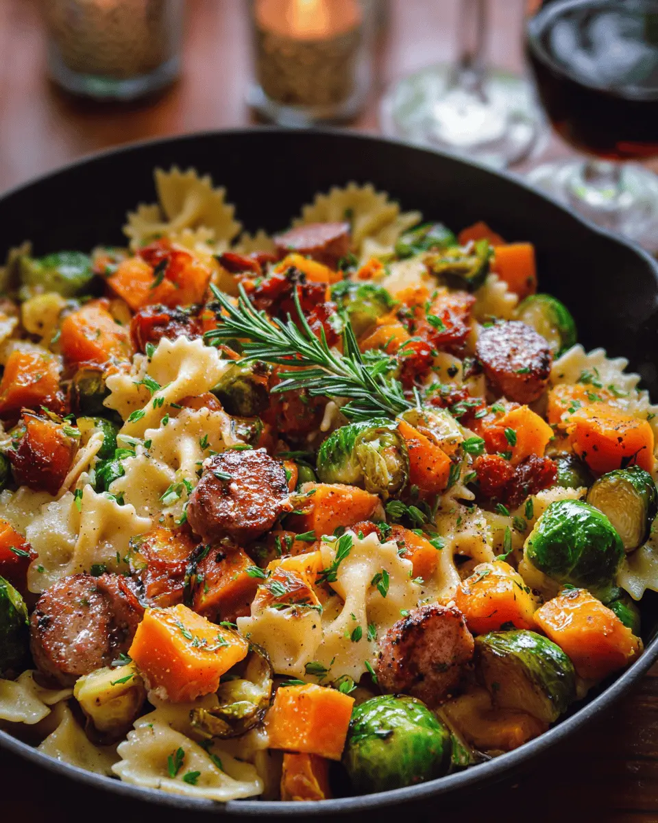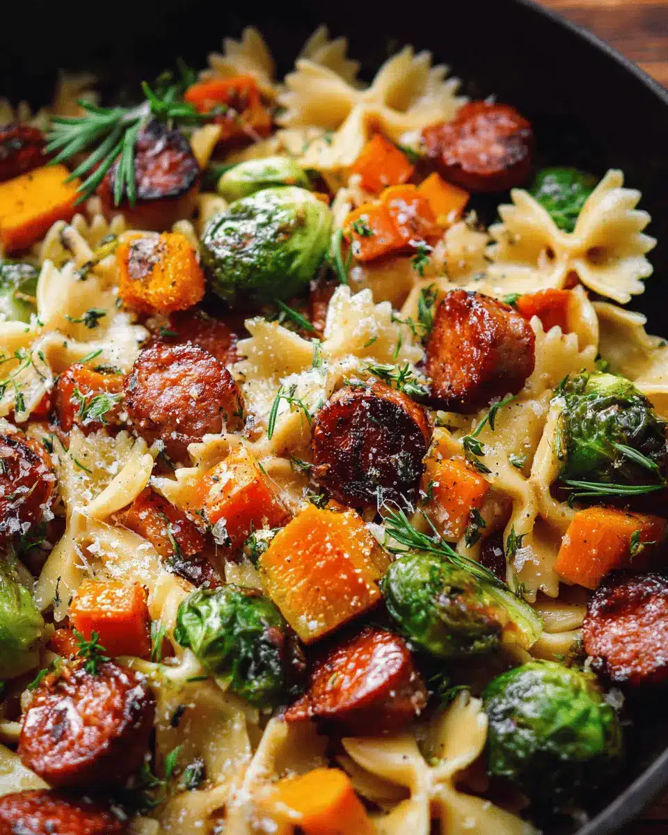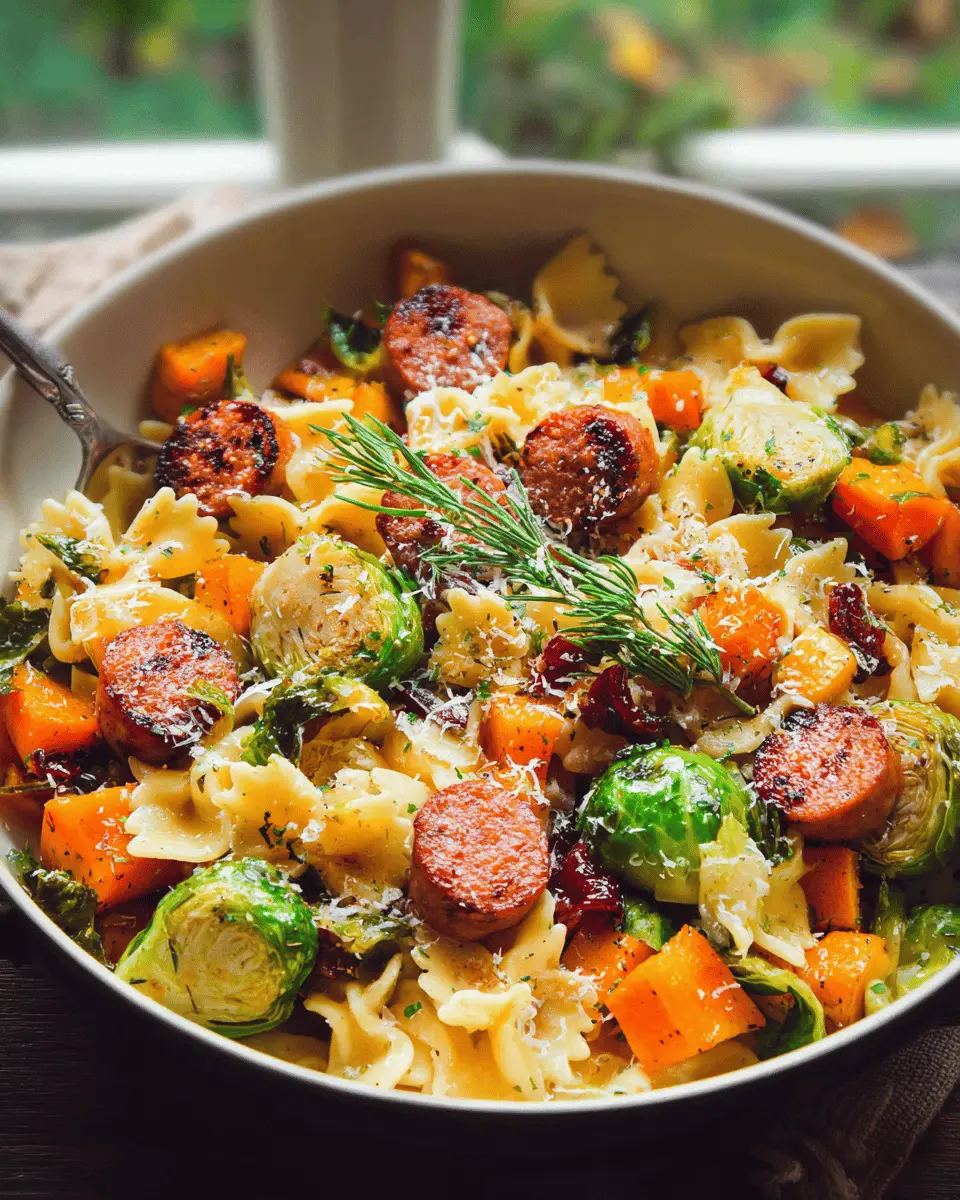 Autumn Dinner with Sausage, Pasta, Brussels Sprouts and Butternut Squash