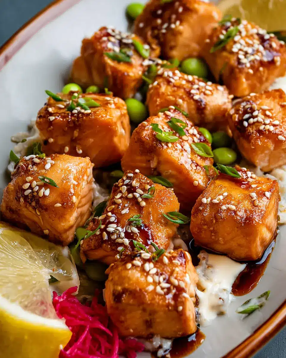 The crowning glory of your Bang Bang Salmon Bites is the sauce! Combine ¾ cup of mayonnaise with ½ cup of Thai sweet chili sauce, a tablespoon of sriracha, and a splash of soy sauce for that umami kick. A teaspoon of honey, paired with a clove of minced garlic, brings everything together beautifully. Whisk these ingredients until smooth, and drizzle over your salmon bites right after they come out of the oven for an explosion of flavor!