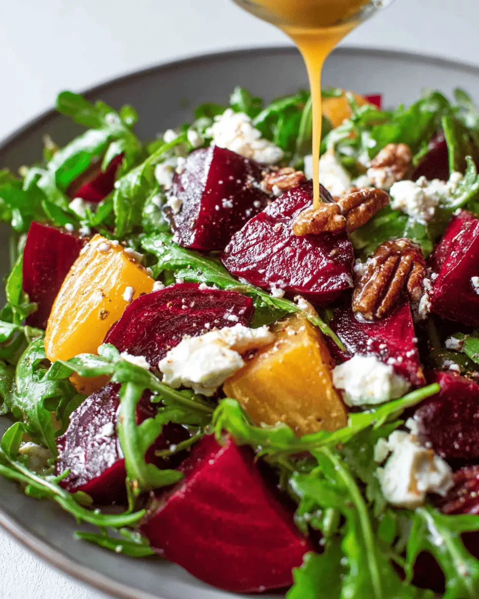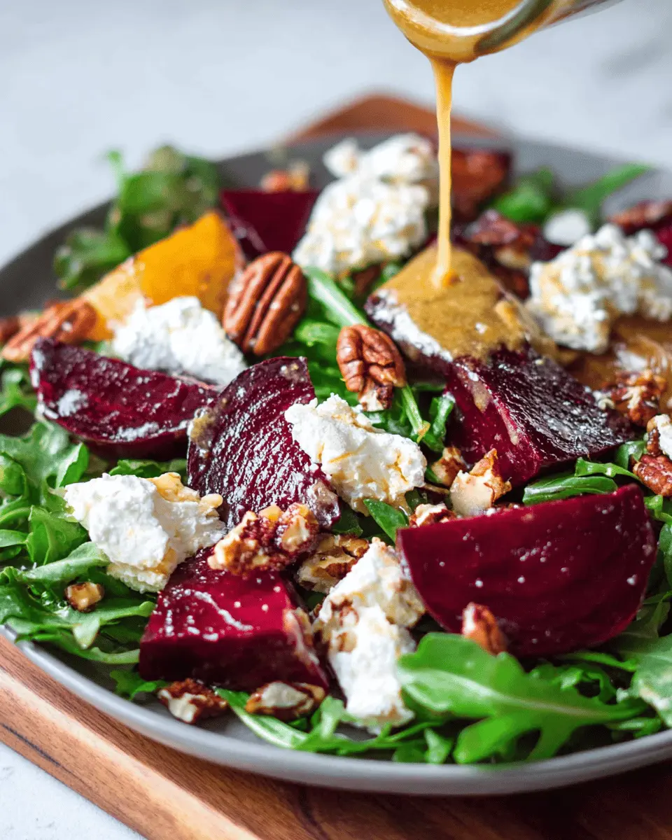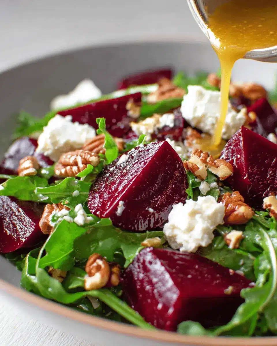 In summary, this delightful Beet and Arugula Salad with Goat Cheese is a perfect dish for both lunch and dinner. The combination of earthy beets, peppery arugula, and creamy goat cheese makes for a nutritious and visually stunning meal. Enjoy it fresh for the best flavor and texture.