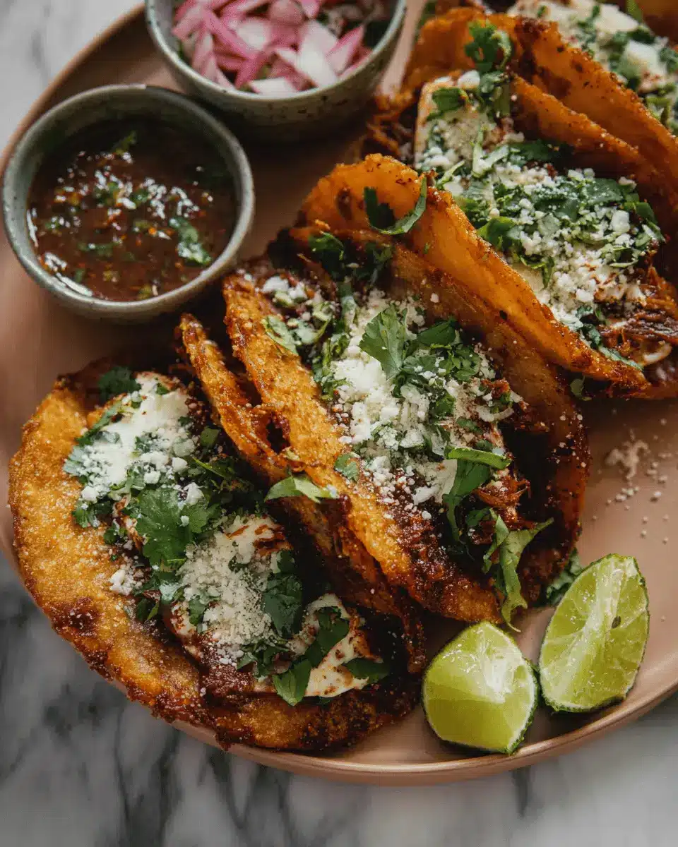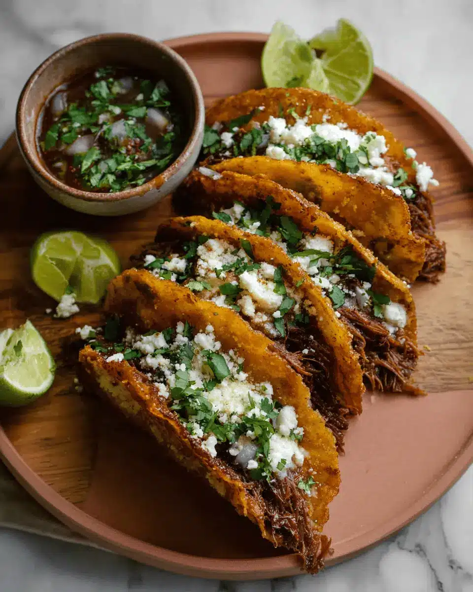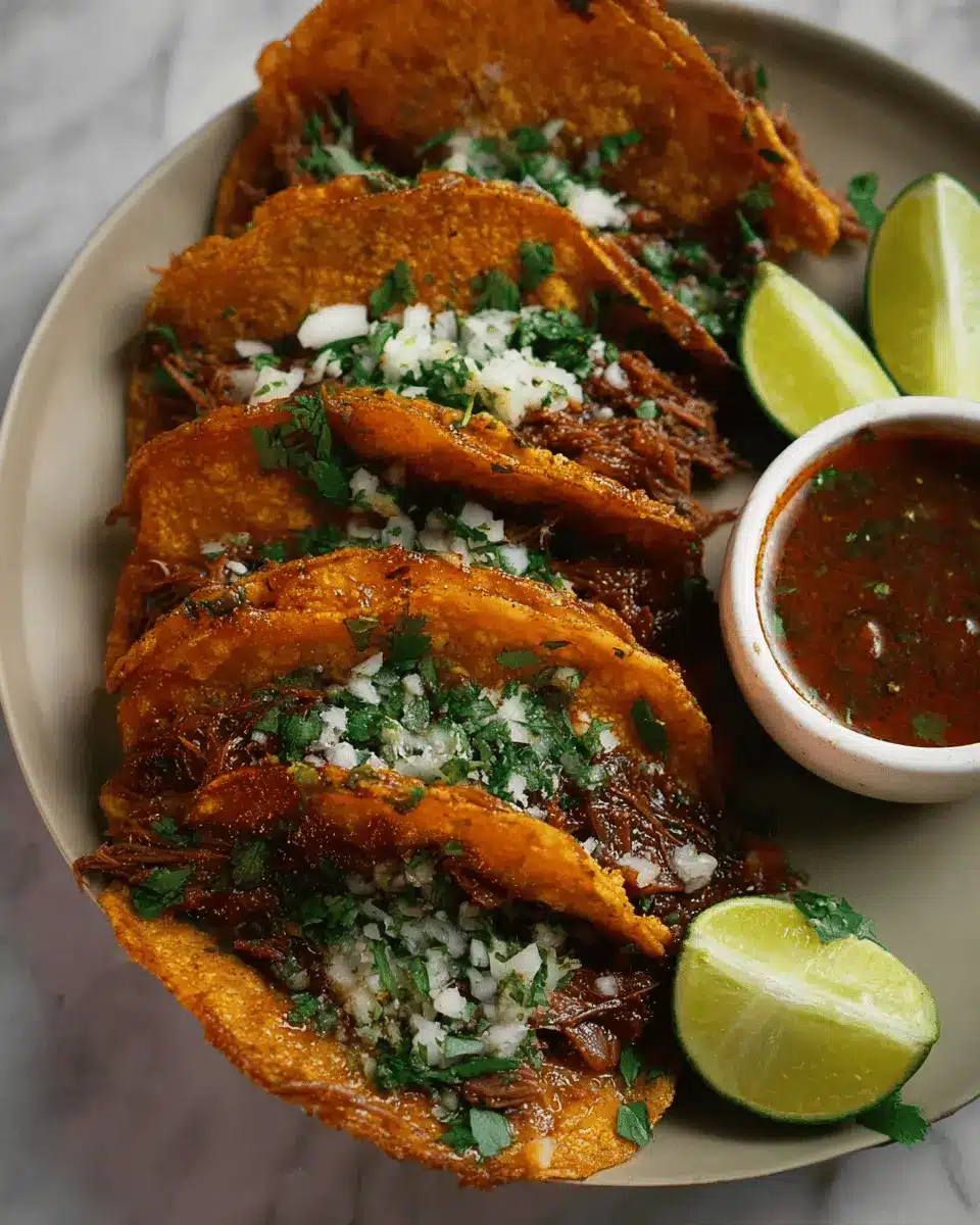 Presentation can elevate your meal! Stack your Birria Tacos on a rustic wooden board, topped with a sprinkle of cilantro and lime wedges. Use vibrant bowls for the consomé to create a colorful contrast. Consider adding sliced radishes or pickled onions for a touch of crunch and color—this not only looks appealing but adds extra flavor, too. The visual feast will surely impress your guests and enhance your dining experience!