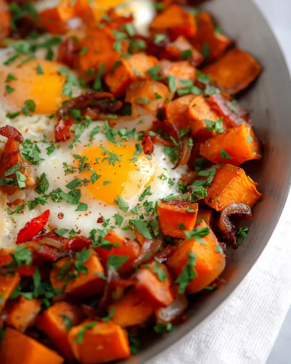 Egg Toppings: Serve your sweet potato hash as a vibrant bed for eggs cooked to your liking. Whether you prefer poached, scrambled, or fried, the yolk adds a rich creaminess.