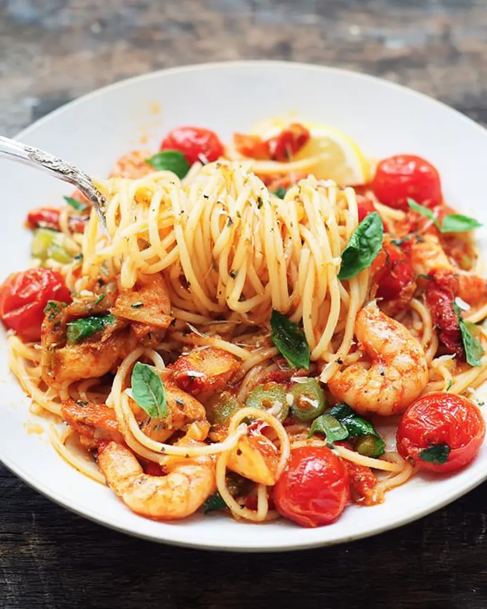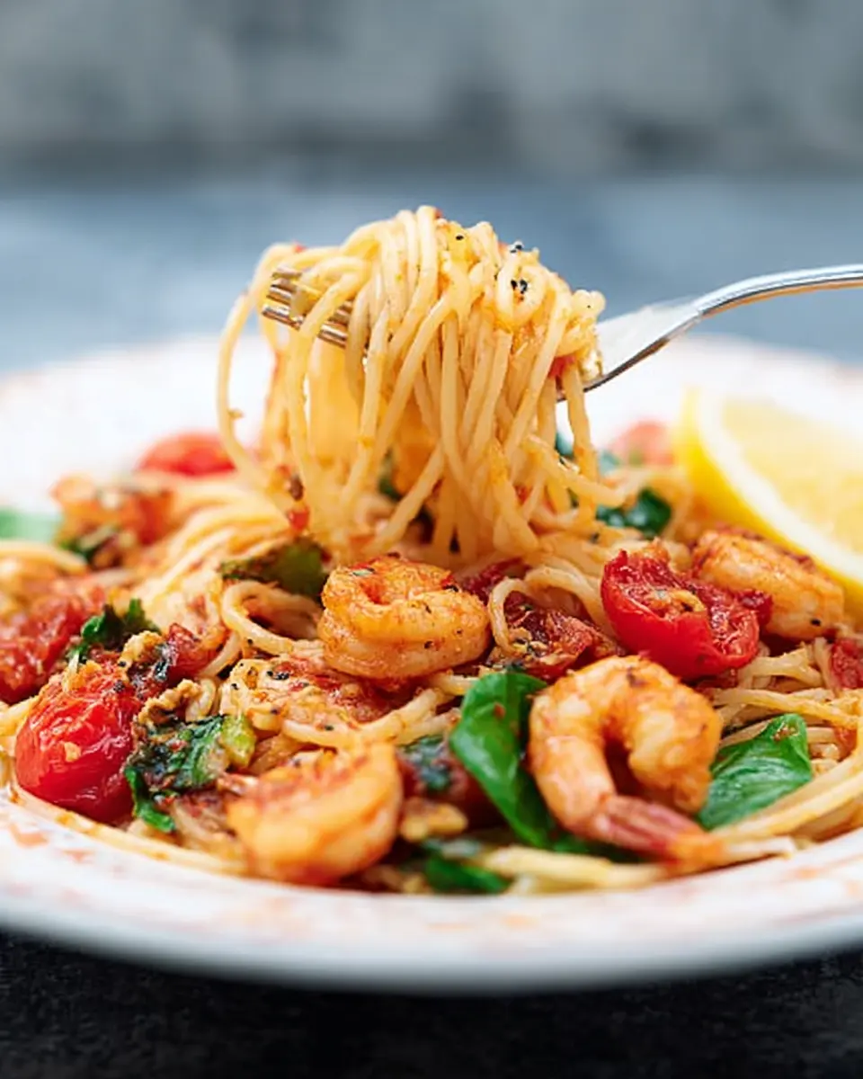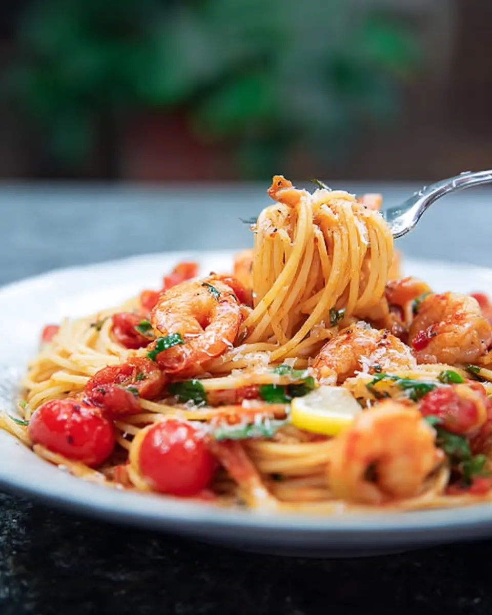 Chilli Prawn Pasta with Tomato, Lemon and Garlic