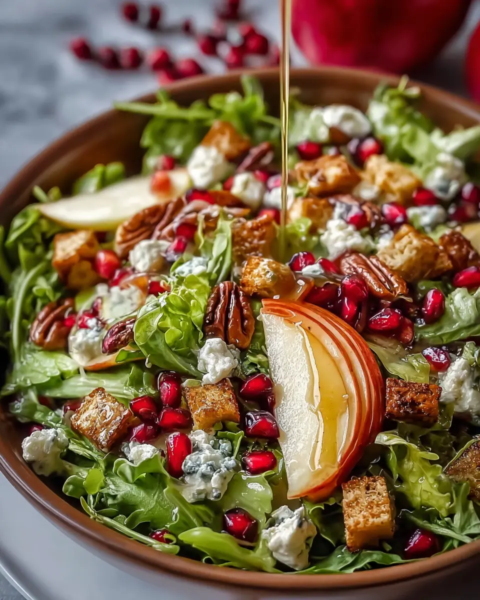 In a large salad bowl, combine 6 cups of mixed greens (spinach works wonderfully too), 2 cups of frisée leaves, 1 to 2 sliced apples or pears, 2 cups of pomegranate seeds, and 2 diced avocados. This mix creates a vibrant and colorful base for your salad. Drizzle half of your honey mustard dressing over the salad mixture and toss gently. Tossing gently is key here; you want to keep the ingredients fresh without bruising the delicate greens.