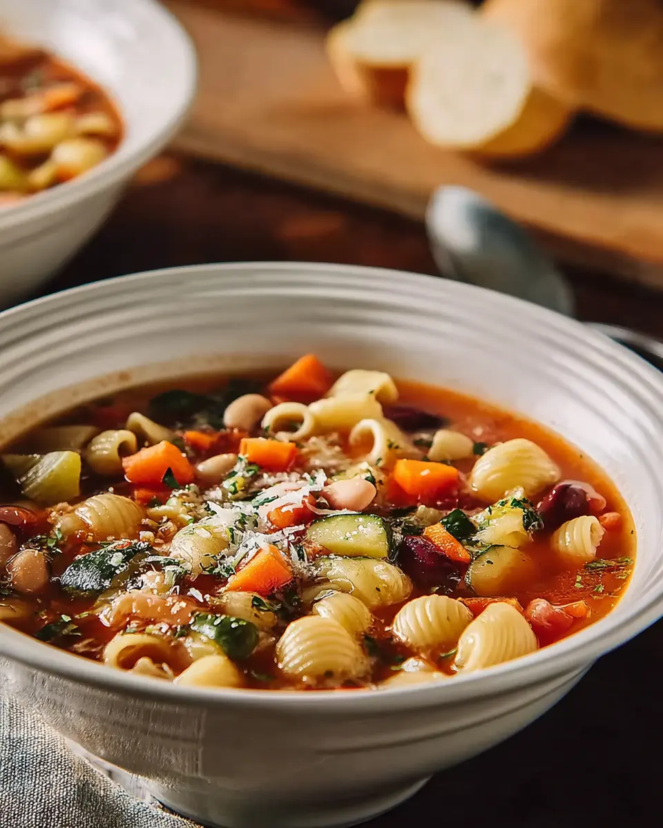 Ladle your hearty soup into bowls, and don’t forget to sprinkle some shredded Parmesan cheese on top—because everything is better with cheese! Serve with a slice of crusty bread for dipping, and enjoy a dish that’s both nourishing and satisfying. Sharing this classic minestrone soup with friends or family will surely bring smiles to the table. Remember, it’s not just about the meal—it's about the love and laughter shared!