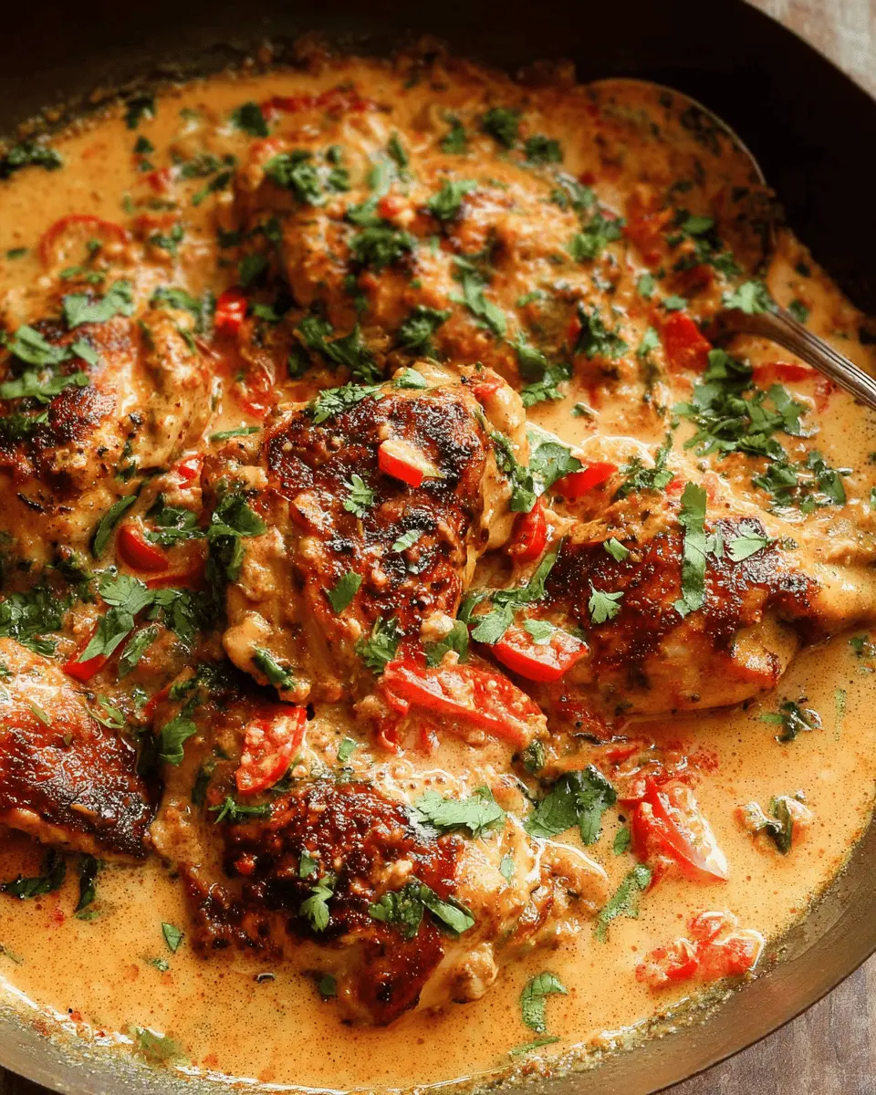 Return the seared chicken to the skillet, reduce the heat to medium-low, and let it cook for an additional 4 to 5 minutes, or until the chicken reaches an internal temperature of 165˚F. Once done, don’t forget to taste the sauce and adjust the seasoning if needed. Finish off your dish with a sprinkle of fresh cilantro and lime wedges on the side.