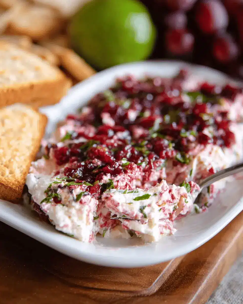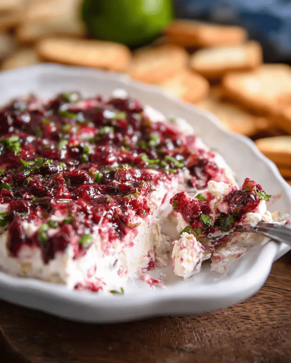 In addition, you can serve the Cranberry-Jalapeno Cream Cheese Dip with a variety of options like crackers, toast, or even fresh veggies, making it versatile for any occasion. Plus, its vibrant colors make it an eye-catching addition to any charcuterie board or party spread.