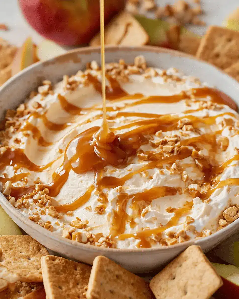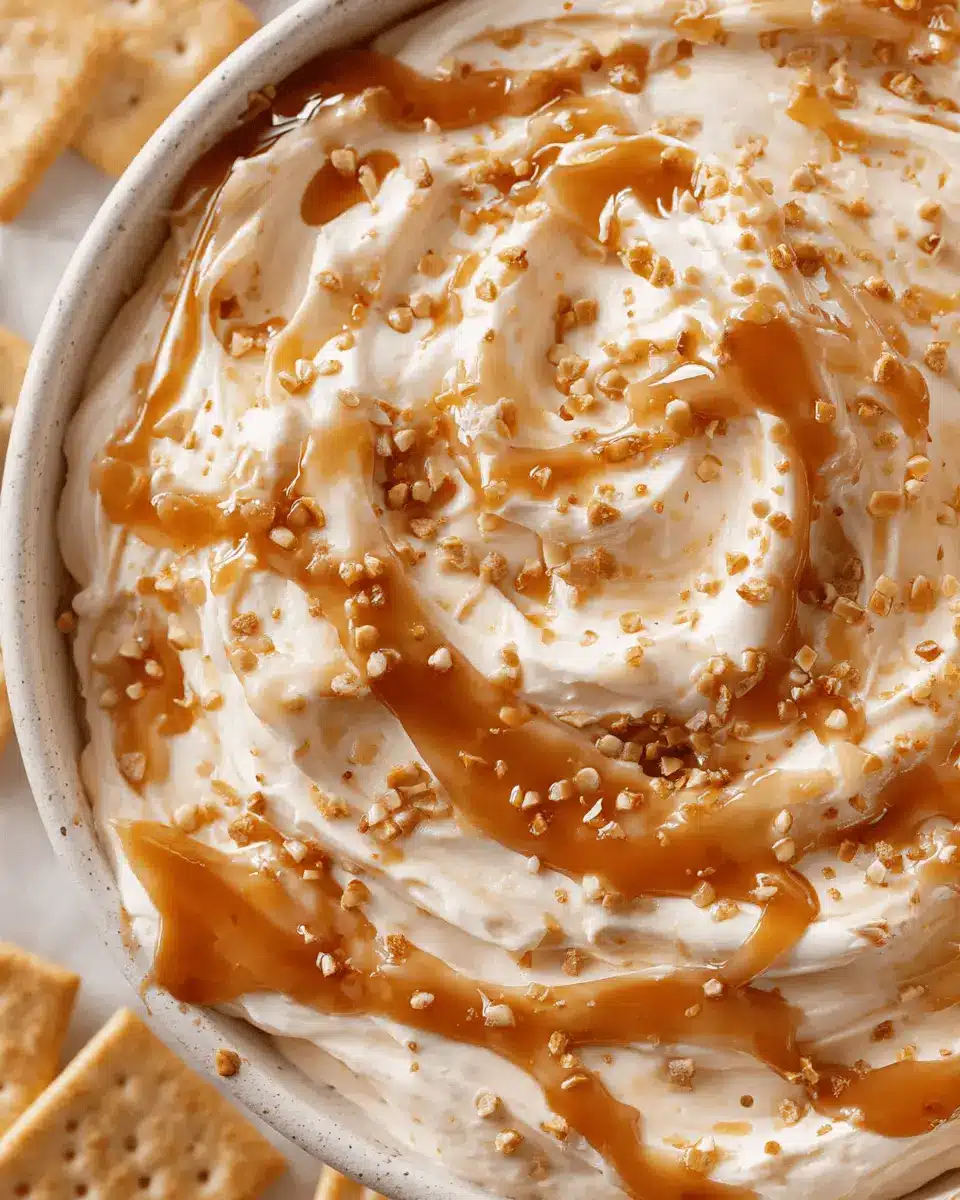 Last but certainly not least, sprinkle the toffee bits or chopped nuts on top. This adds a satisfying crunch that complements the creamy and sweet elements beautifully. Plus, it gives your dip that inviting, polished look.