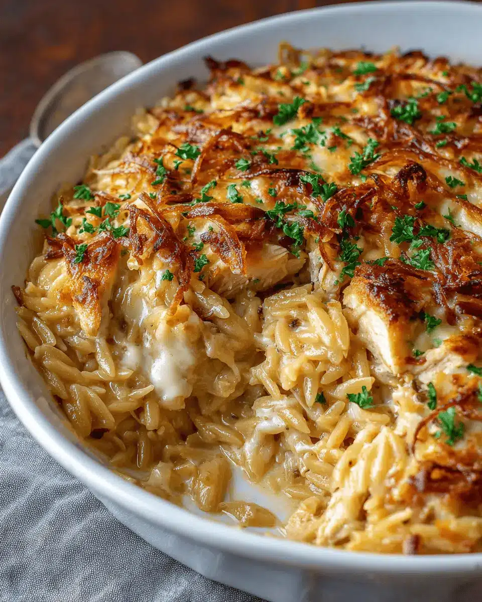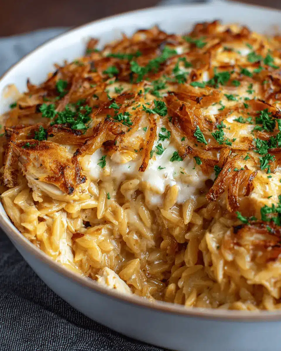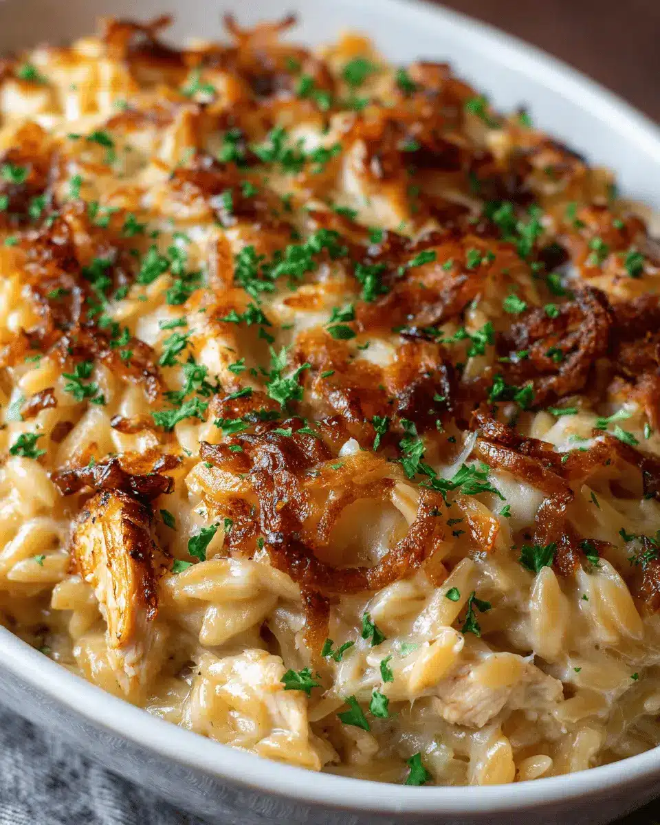 In summary, the French Onion Chicken Orzo Casserole is a delightful dish that offers warm, creamy comfort in every bite. It’s perfect for weeknight dinners or impressing guests. Try this recipe for a cozy gathering, and watch as everyone asks for seconds! You won’t regret it!