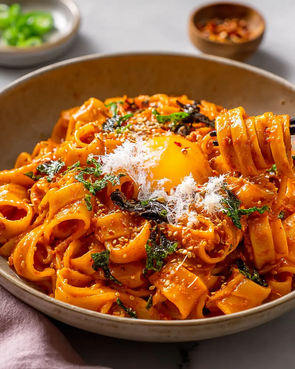 Elevate your Gochujang Pasta with vibrant garnishes that pop! Consider topping your dish with: