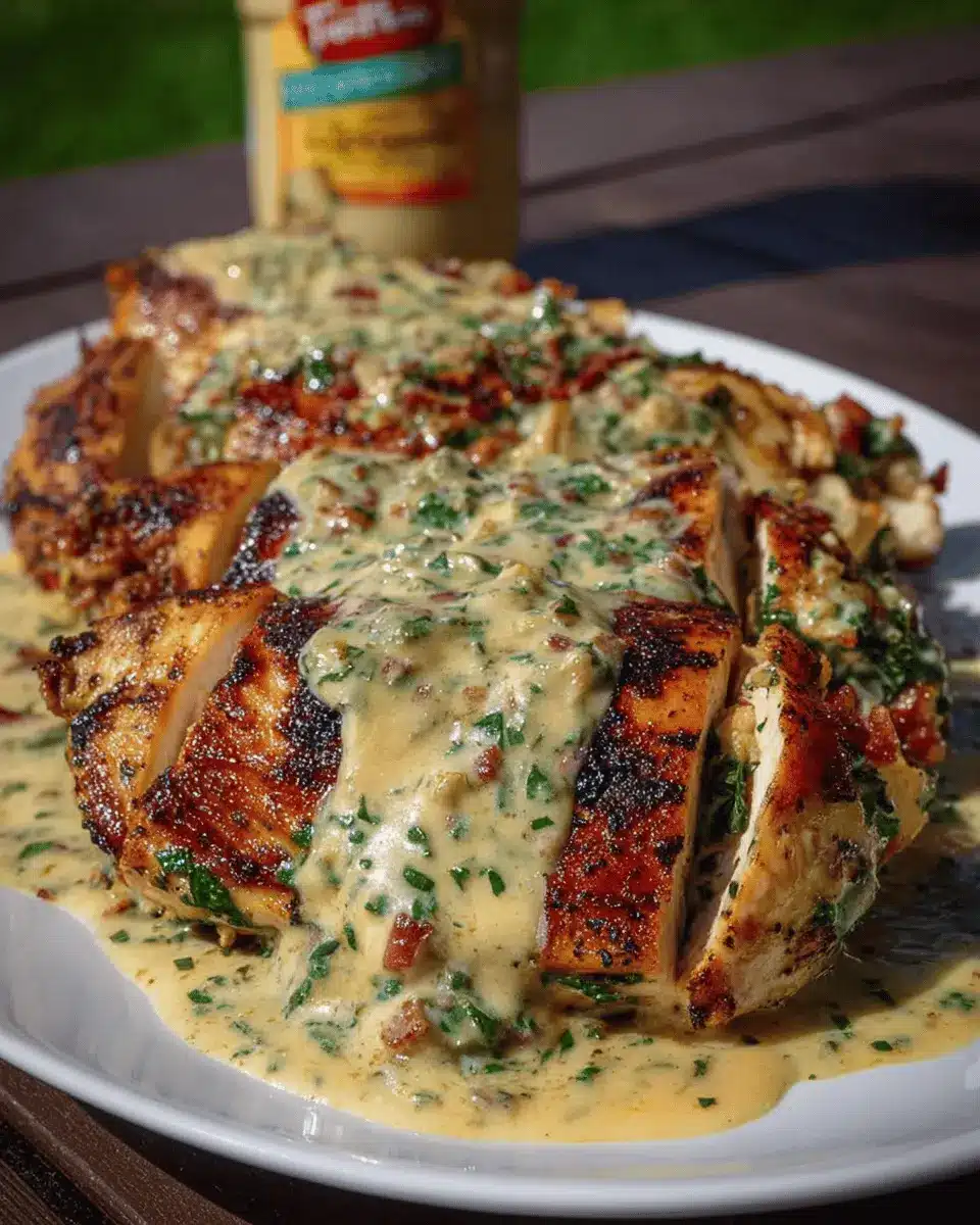 Grilled stuffed chicken is the perfect dish for summer gatherings or cozy weeknight dinners. Its vibrant filling of spinach, sun-dried tomatoes, and cheeses delivers a burst of flavor in every bite. Paired with the creamy sauce, this recipe will become a staple in your meal rotation. Enjoy!