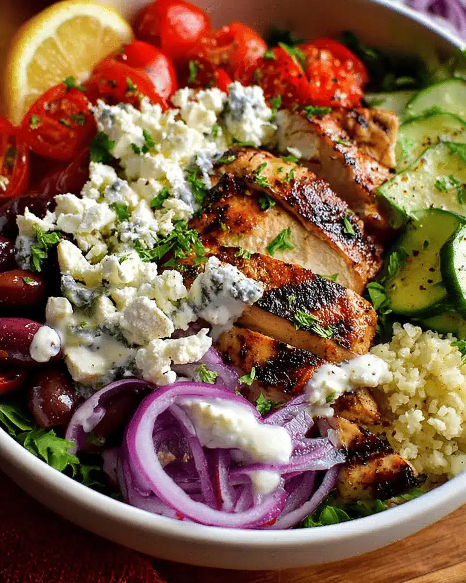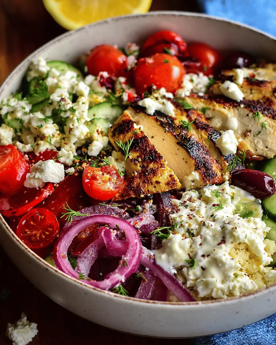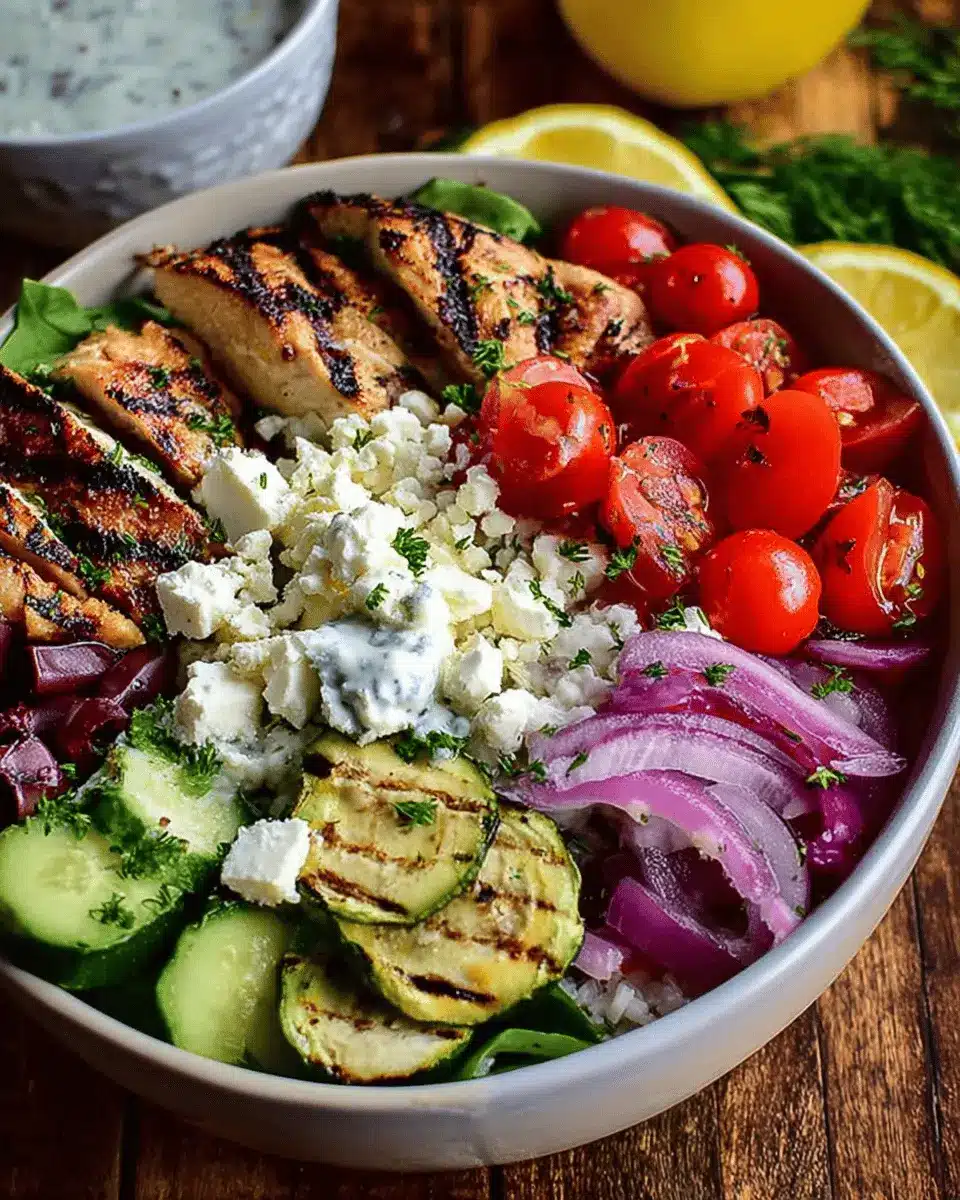 - Layering: Next, artfully arrange your grilled chicken, cucumber, red onion, tomatoes, olives, crumbled feta, tzatziki sauce, and any fresh herbs you desire.