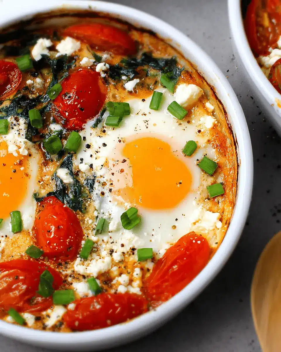 Absolutely! Mediterranean Baked Feta Eggs are perfect for meal prep. You can assemble the dish ahead of time by preparing the vegetable base and crumbling the feta. Just store it in the fridge for up to two days. When you’re ready to eat, crack in the eggs and bake! You can also make individual servings in small baking dishes for quick grab-and-go breakfasts.