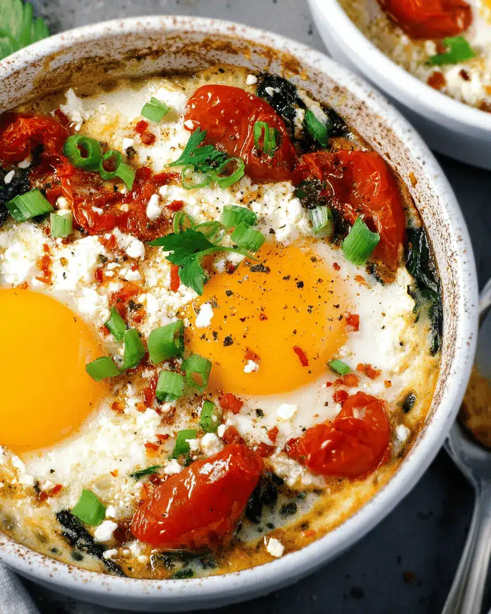 Mediterranean Baked Feta Eggs are an enticing and simple dish that showcases the rich flavors of the Mediterranean. At its core, this recipe features eggs baked atop a luscious bed of crumbled feta cheese, juicy cherry tomatoes, and aromatic herbs—creating a delightful balance of textures and tastes. As the eggs cook, the feta melts, providing a creamy, salty base that complements the runny yolks perfectly. This dish is often paired with crusty bread or pita, making it an irresistible centerpiece for a satisfying breakfast or brunch.