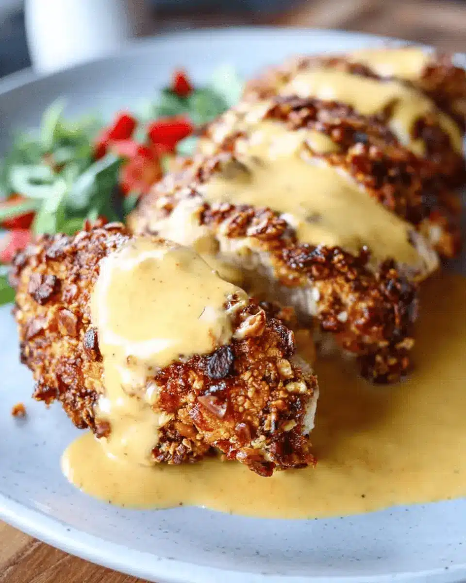 When plating your pretzel-crusted chicken, consider placing it on a rustic wooden board for a farmhouse feel. Drizzle the cheesy mustard sauce artistically on top or serve it in a small bowl on the side for dipping. Scatter fresh herbs, like parsley or chives, around the chicken for a pop of color. If you're feeling adventurous, a sprinkle of sesame seeds atop the sauce can add an unexpected twist.