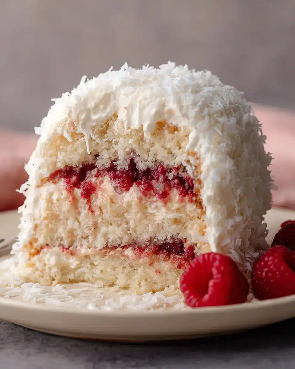 Raspberry Surprise Coconut Snowball Cake