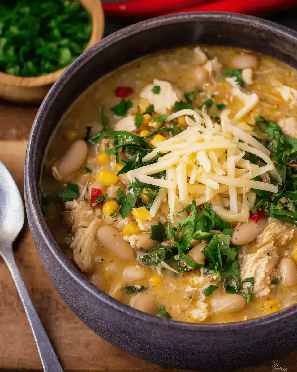 Once your base is established, it’s time for the magic! Stir in the rinsed and soaked white navy beans along with the corn, various chilies, and your carefully measured spices. Among them, you’ll find ground coriander and ancho chili powder, which lend your Southwestern White Chicken Chili its distinctive flavor. Toss in the bay leaves and salt, and add half of your fresh cilantro for an aromatic kick. This combination of ingredients is what truly makes this chili a must-try!