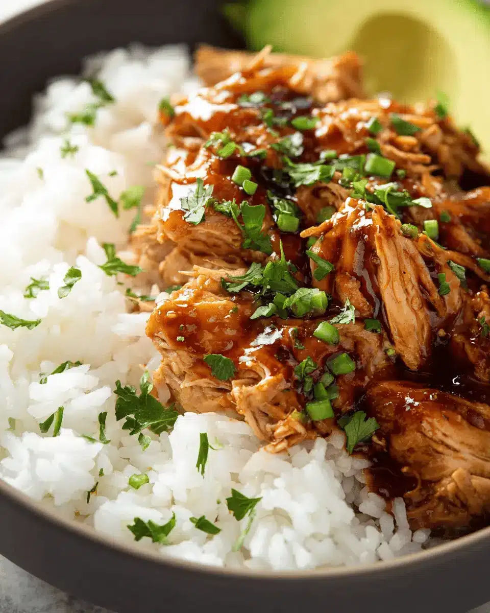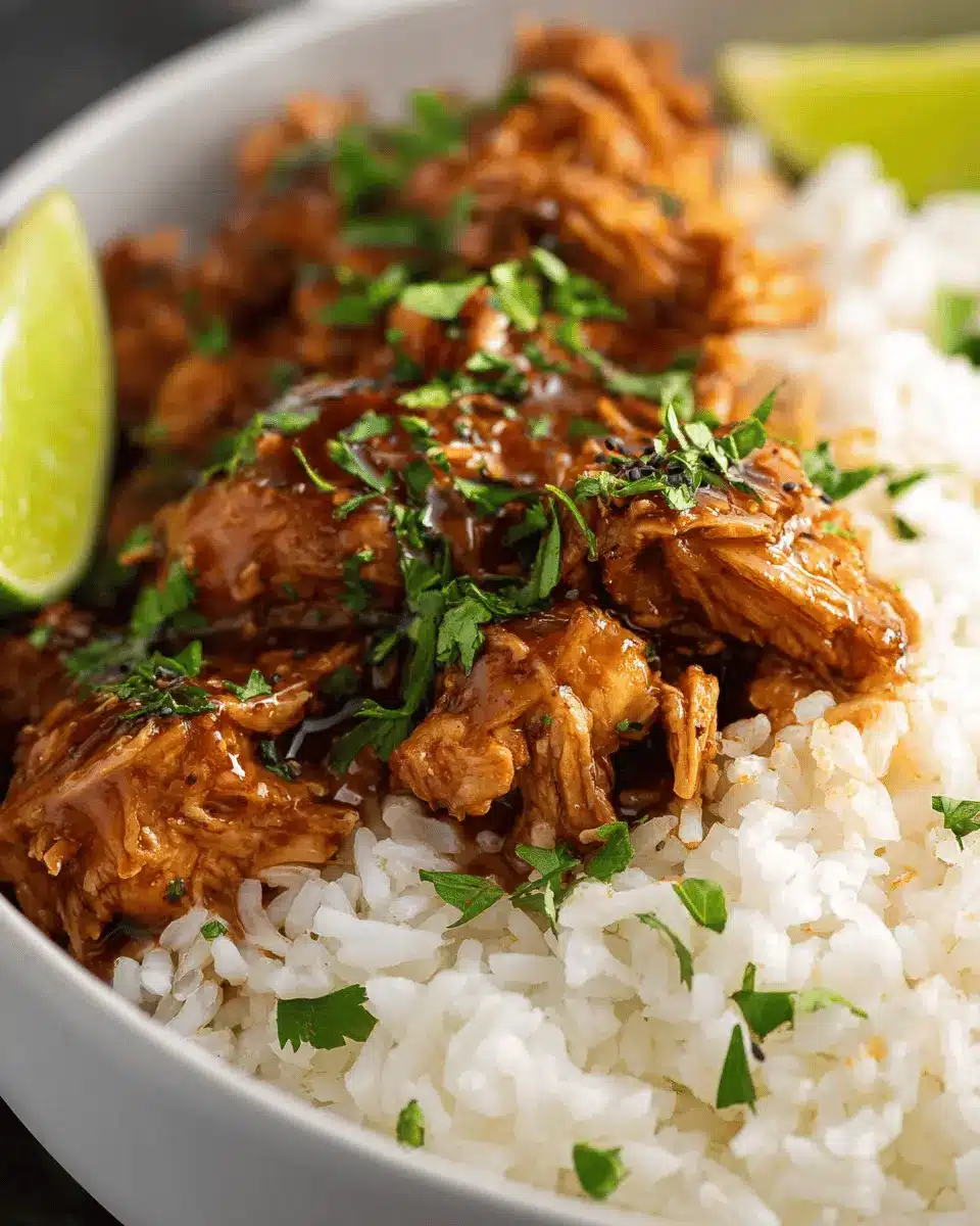 Time to combine everything! Squeeze the juice from half a lime into your sauce for a zesty kick, and if you’d like to add a pop of color and crunch, toss in 1 cup of fresh sugar snap peas. Allow that gorgeous mixture to simmer for an additional minute. While the sauce thickens, it’s time to shred your chicken. You can use two forks or, for a faster method, a stand mixer (yes, it works wonders!). Once shredded, stir the chicken back into the sauce and mix thoroughly to ensure every piece is coated in that sticky goodness.