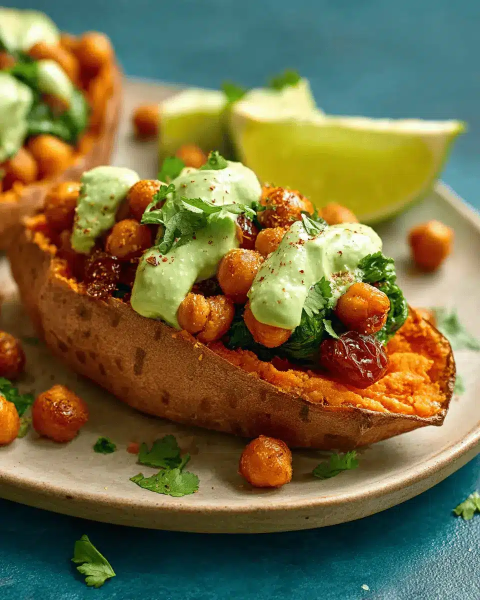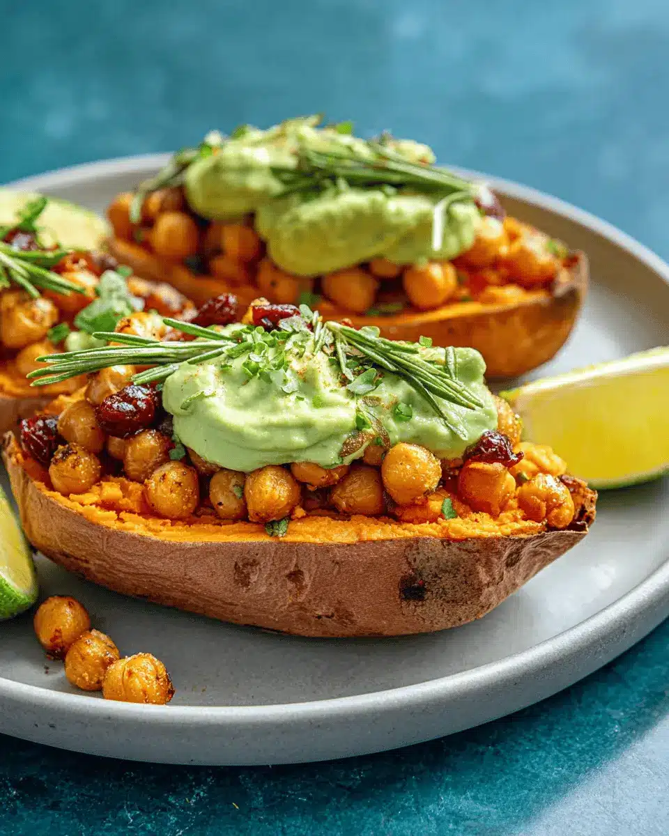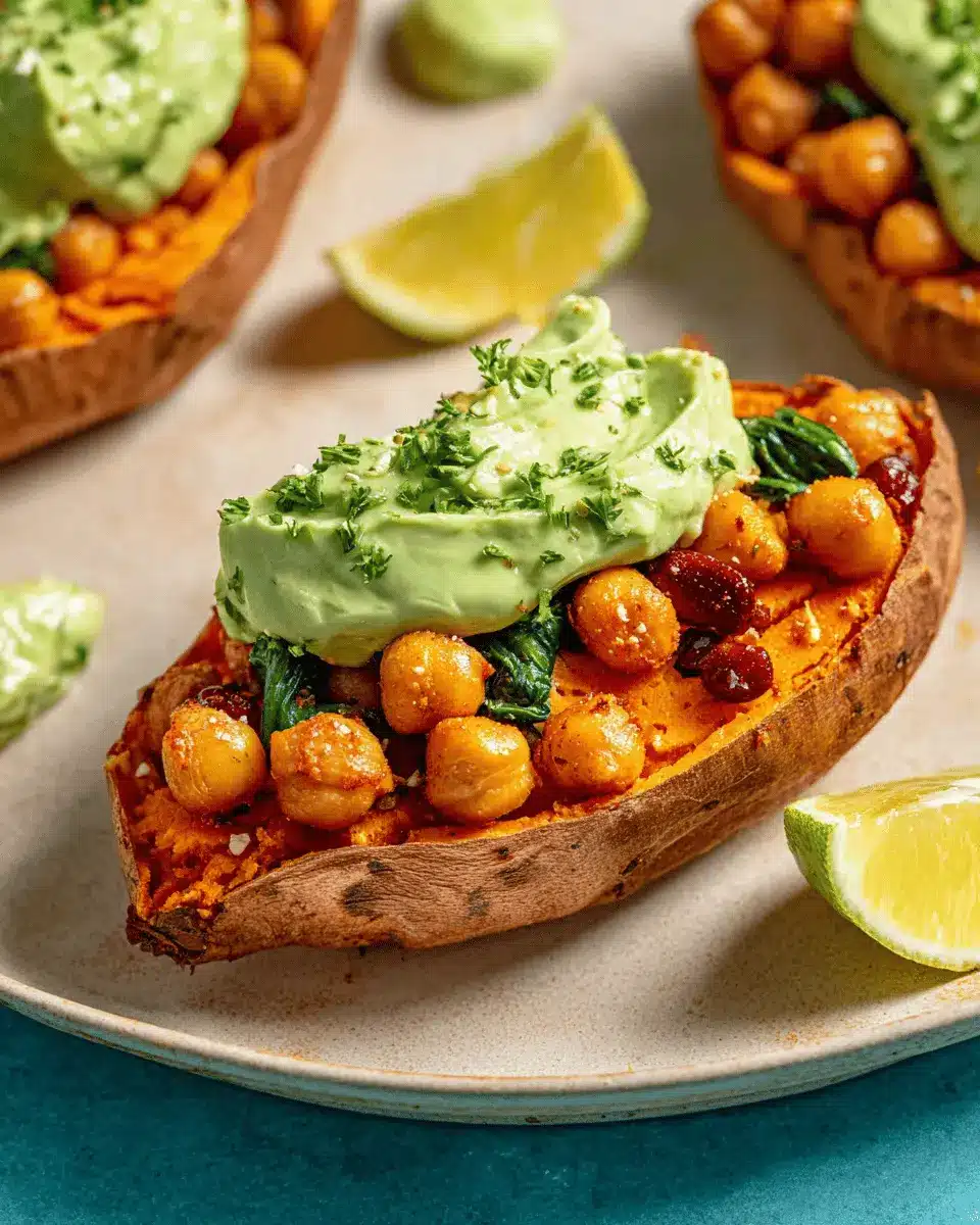 Stuffed Sweet Potatoes with Chickpeas and Avocado Crema