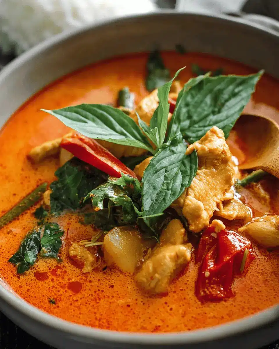 Garnishing your Thai Red Curry with Chicken adds a pop of color and flavor. Consider topping it with fresh cilantro leaves and slices of red chili for a spicy kick. Chopped green onions or a squeeze of lime juice can also brighten the dish. For a bit of texture, you might sprinkle some toasted coconut flakes or crushed peanuts on top. These simple touches not only enhance the presentation but also elevate the overall taste experience.