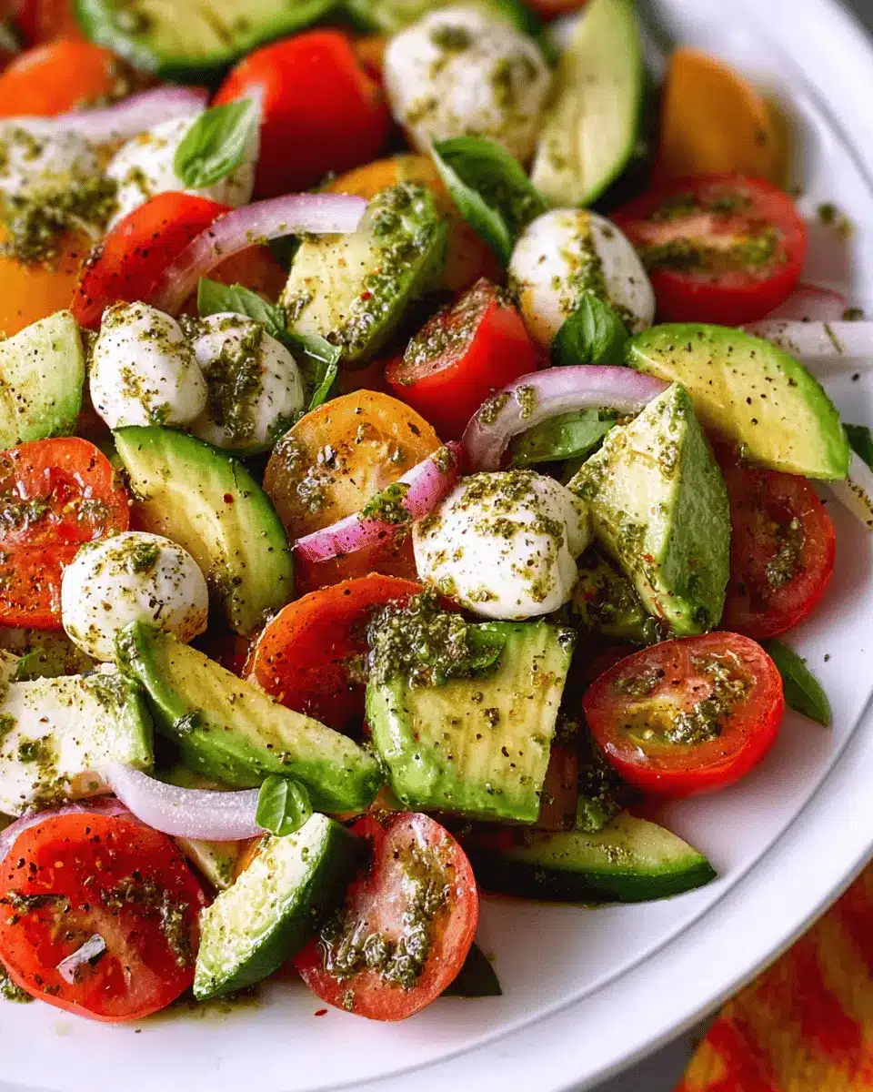 Introduction to Tomato Cucumber Avocado Salad with Mozzarella and Basil Pesto