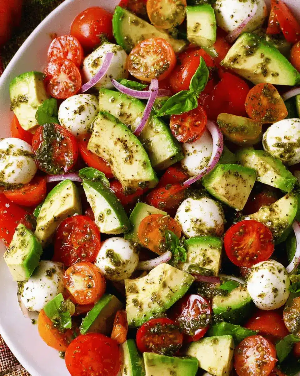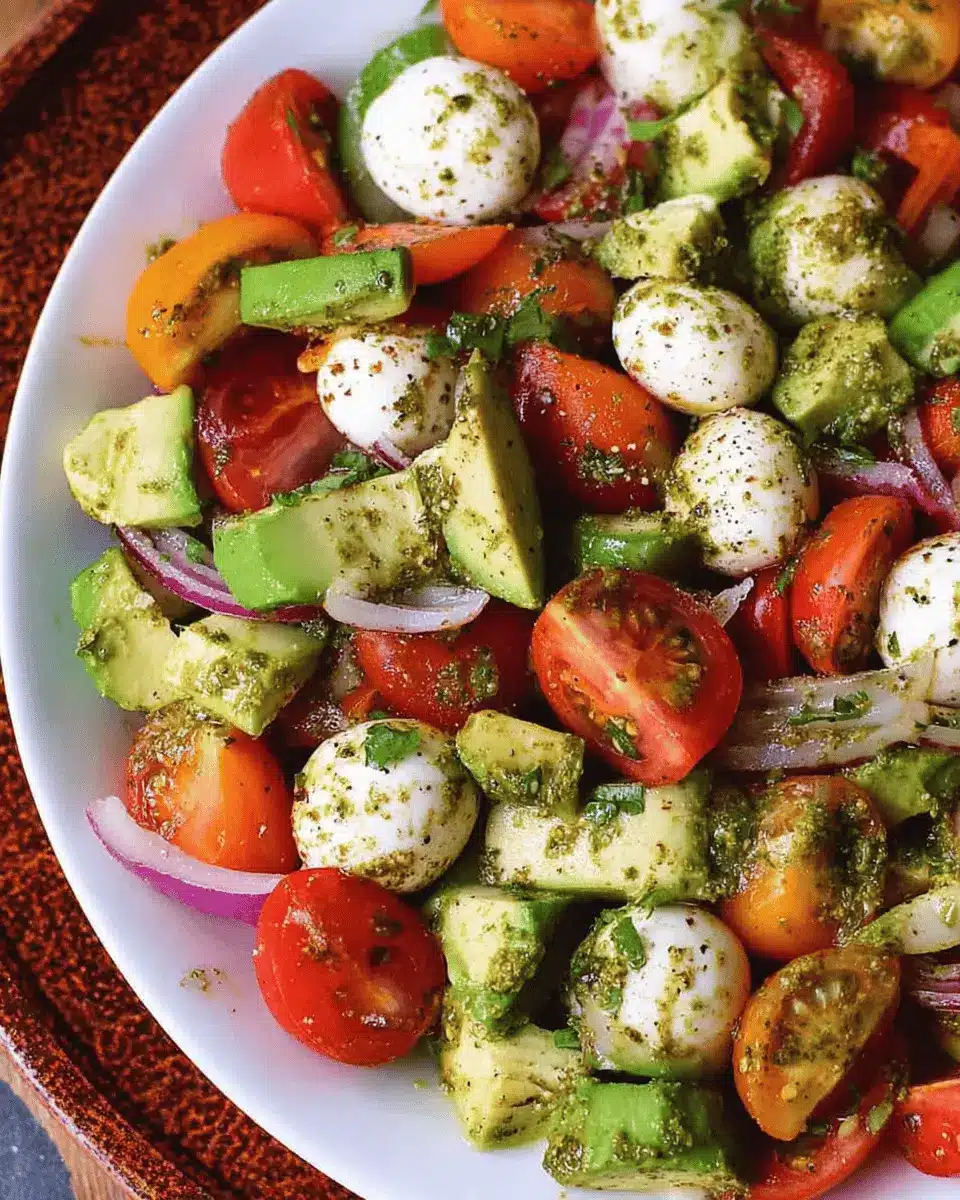 Looking for a recipe that feels like summer in a bowl? The Tomato Cucumber Avocado Salad with Mozzarella and Basil Pesto is just the dish for you! Bursting with vibrant colors and fresh flavors, this salad is not only a feast for the eyes but also a powerhouse of nutrition, making it a perfect choice for busy young professionals.