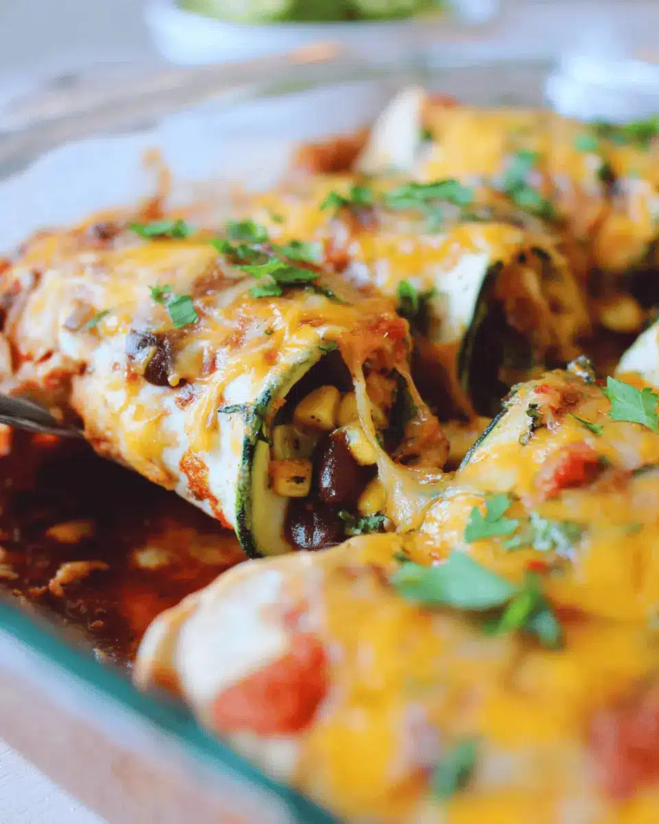 If you’re craving heat, spicy zucchini enchiladas are the way to go! Add chopped jalapeños or drizzle some sriracha into the chicken mixture for a fiery kick. You could even spice up the enchilada sauce by mixing in cayenne pepper or chipotle powder. Serving them with a cooling crema or sour cream can beautifully balance the heat!